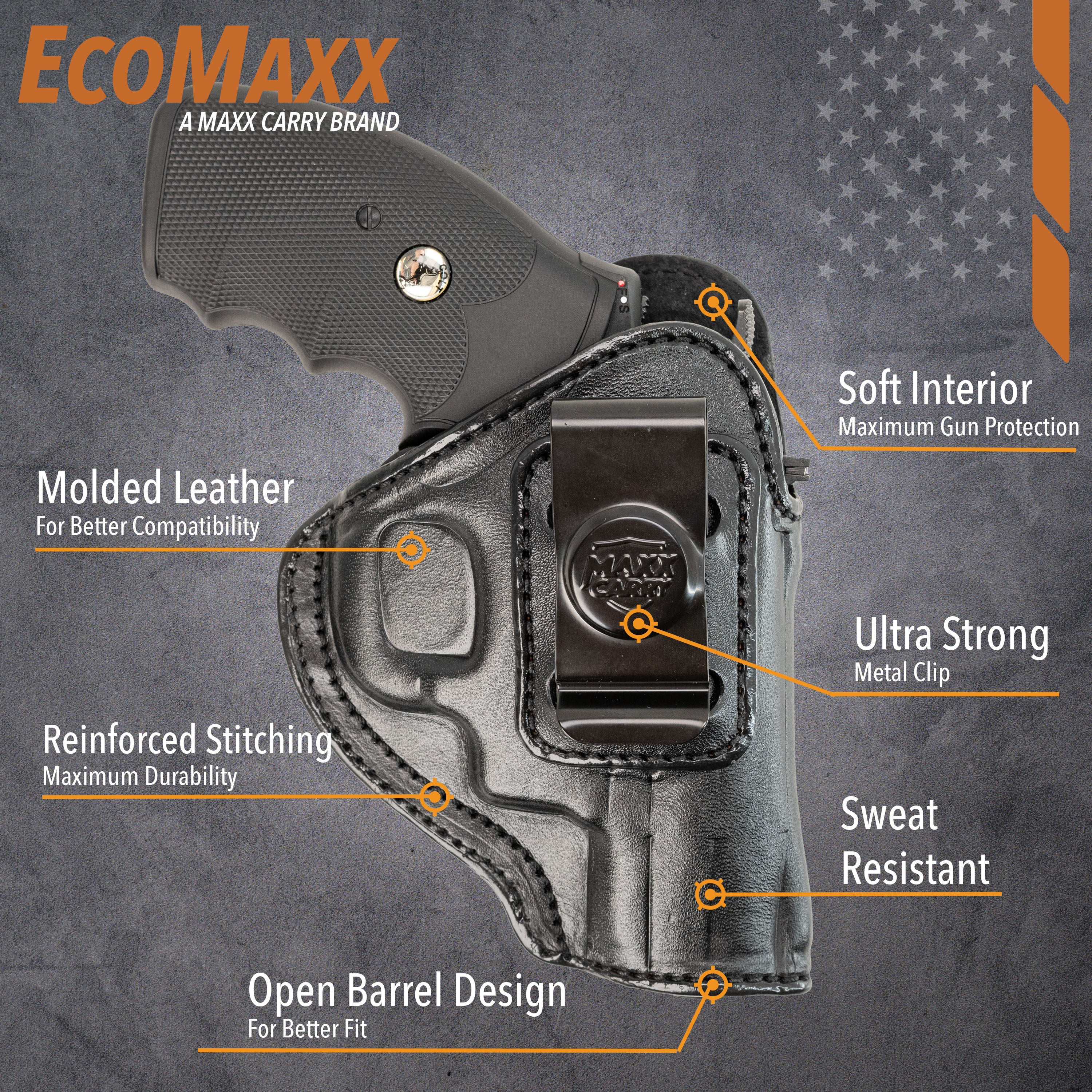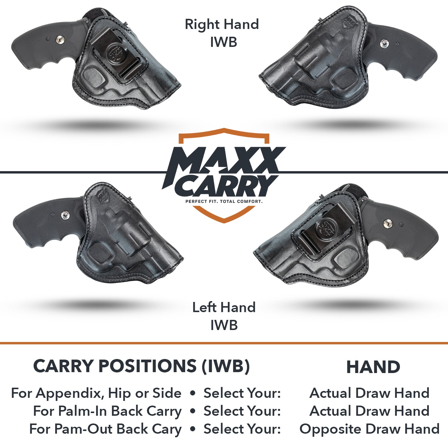 Experience superior concealment and comfort with this premium MAXX CARRY IWB (Inside Waistband) leather holster, Compatible with most 6-shot K & L frame revolvers featuring 2", 3" or 4" barrel lengths. .38, 357, 9mm, 44 cal. Charter Arms Pitbull revolver 9mm .45, Stainless Bulldog .44, Rosi Revolver, Colt Python, Ruger SP101. S&W 357 Magnum.