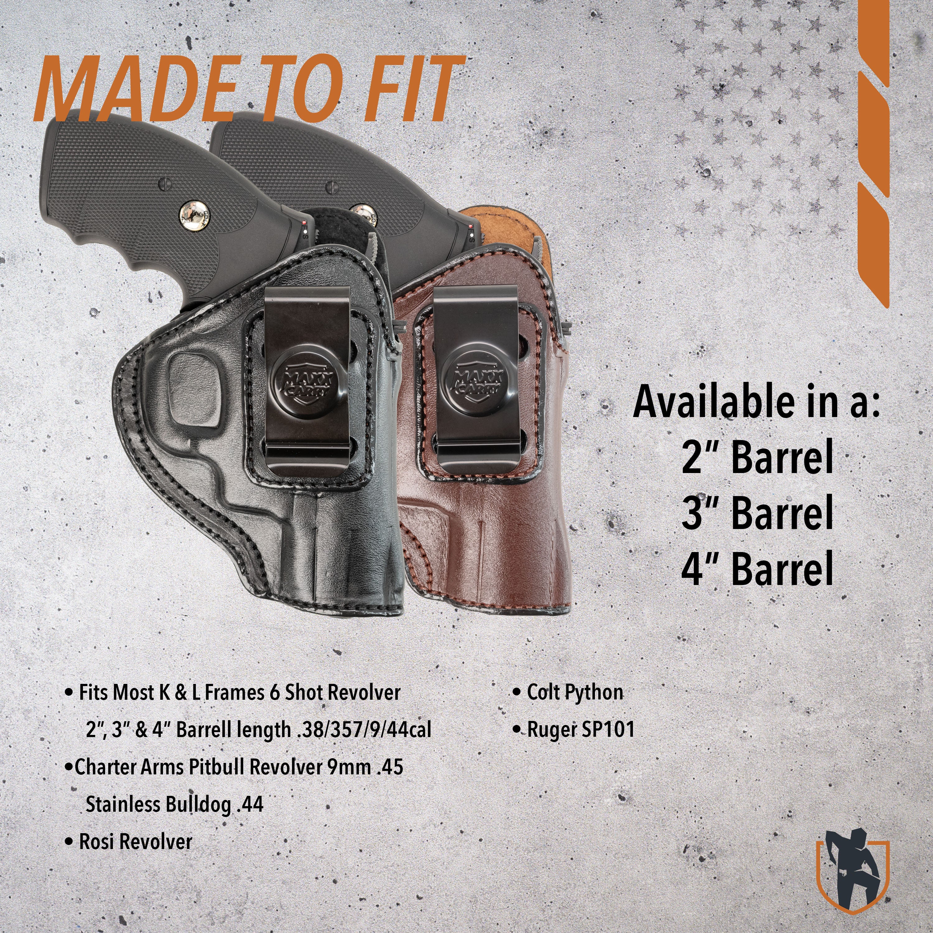 LEATHER IWB FIT: Compatible with most 6-shot K & L frame revolvers featuring 2", 3" or 4" barrel lengths. .38, 357, 9mm, 44 cal. Charter Arms Pitbull revolver 9mm .45, Stainless Bulldog .44, Rosi Revolver, Colt Python, Ruger SP101. S&W 357 Magnum.