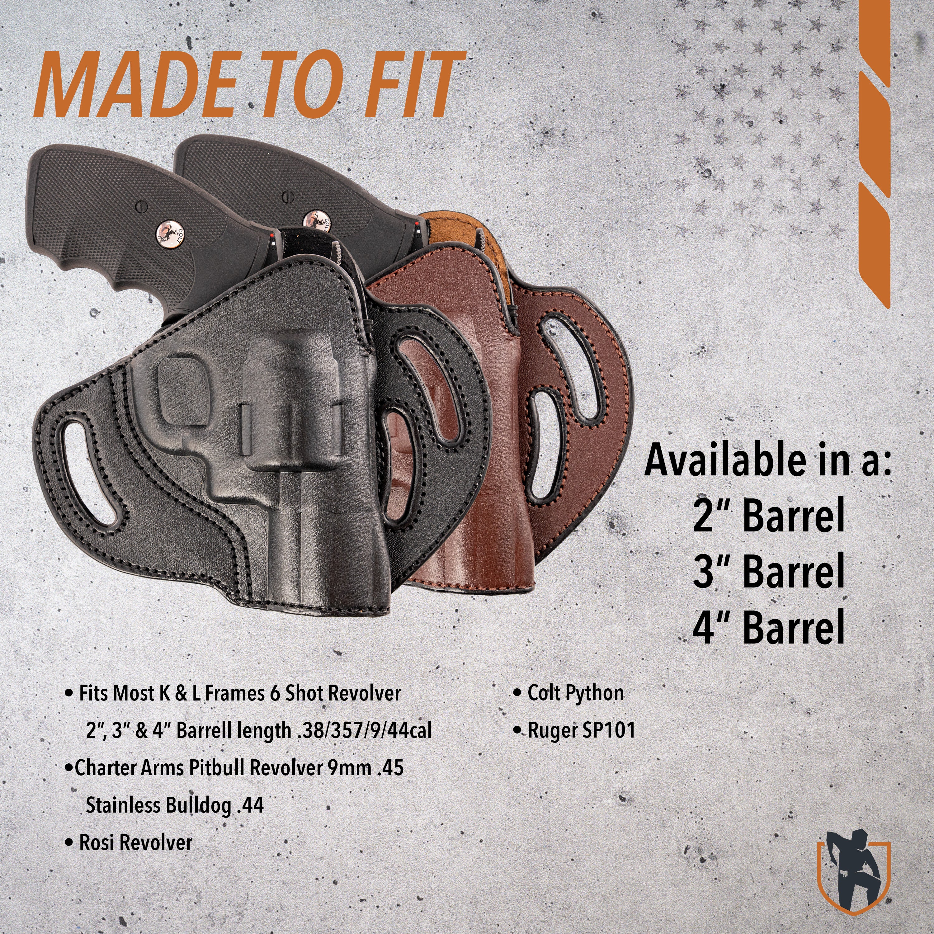 Available in: Black or Brown — Right or Left Hand — Fits 2”, 3”, and 4” Barrels.