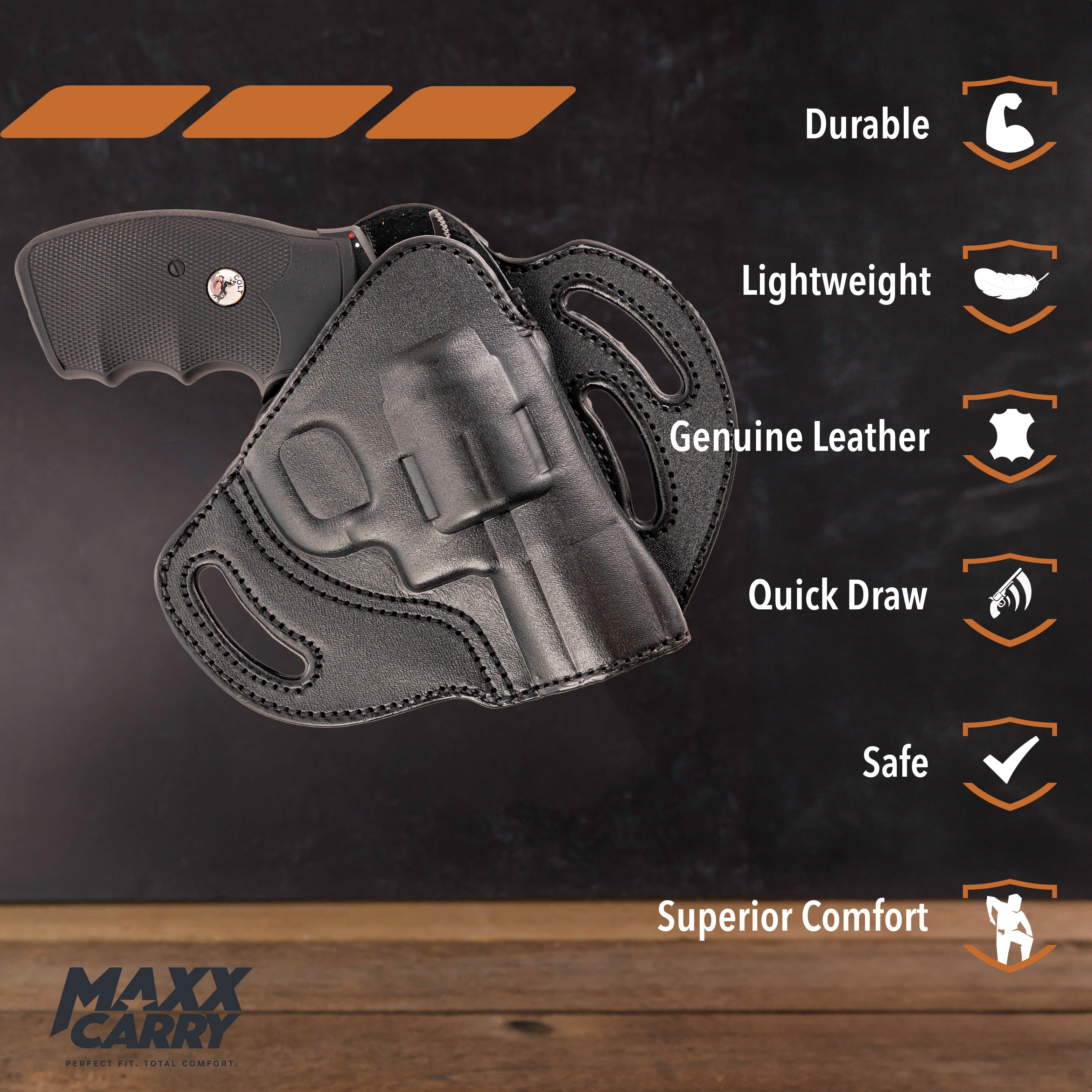 MAXX CARRY Open-Top Pancake Holster – Premium Full-Grain Leather Belt Holster for 6-Shot Revolvers (.38/.357/.44 Cal) – 3-Slot Design for Straight or Forward Cant Carry – Fits K & L Frame, Ruger SP101, Colt Python.